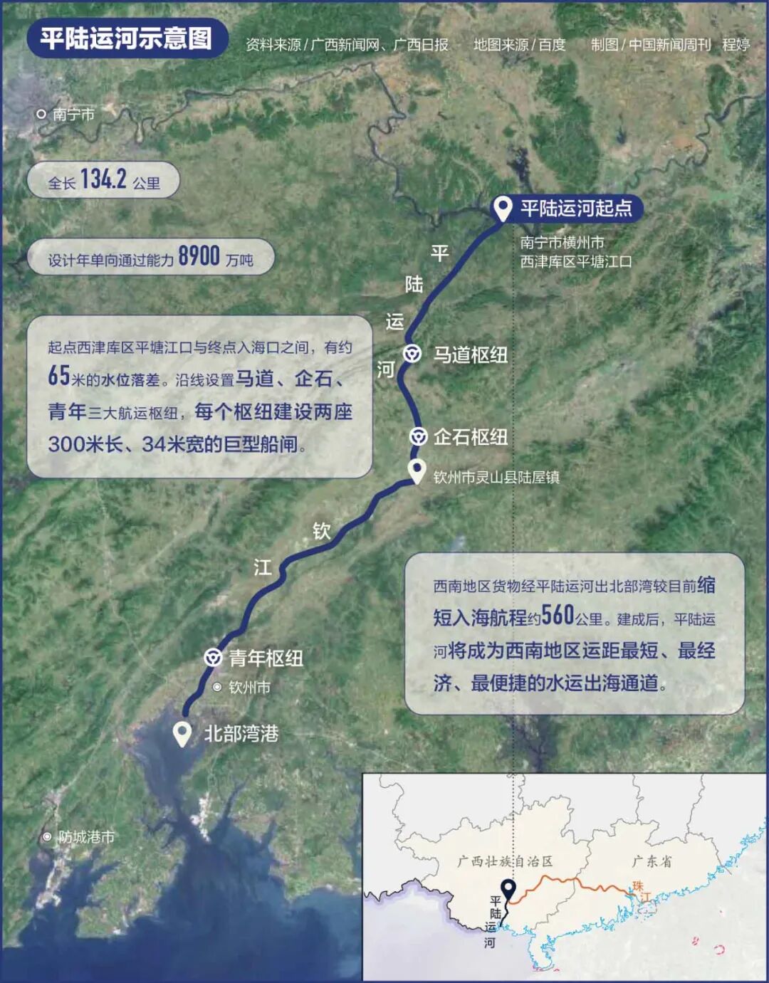 作为西部陆海新通道骨干工程,平陆运河是新中国成立以来第一条连通江海的运河工程,运河起点于南宁平塘江口,经钦州灵山县陆屋镇沿钦江进入北部湾,拥有134.2公里航程,已于2022年8月28日正式开工建设。