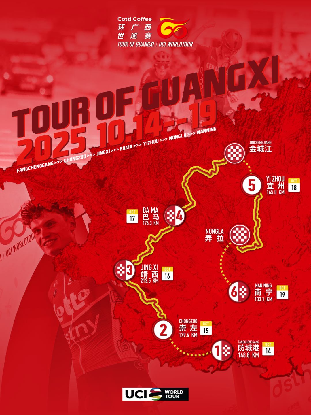 环广西世巡赛是国际自行车联合会(UCI)世巡赛赛季的收官之战,本届赛事共6个赛段,依次为防城港城市赛段、崇左—靖西赛段、靖西—巴马赛段、巴马—金城江赛段、宜州—弄拉景区赛段及南宁城市赛段,竞赛总距离为1017.1公里。