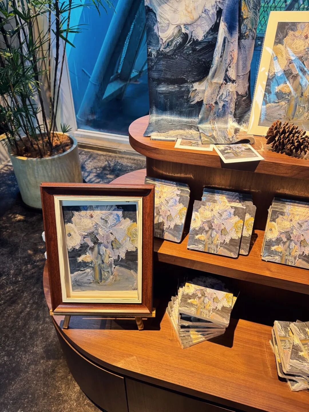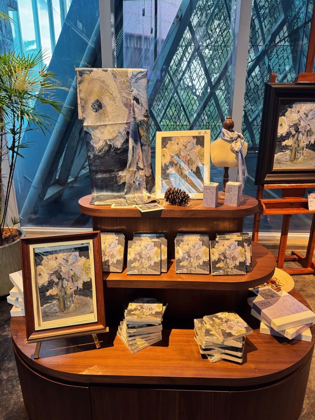 文创店里的商品都很有设计感,比如印有广西美术馆建筑图案的笔记本、以展览作品为灵感的冰箱贴、壮锦纹样的书签。