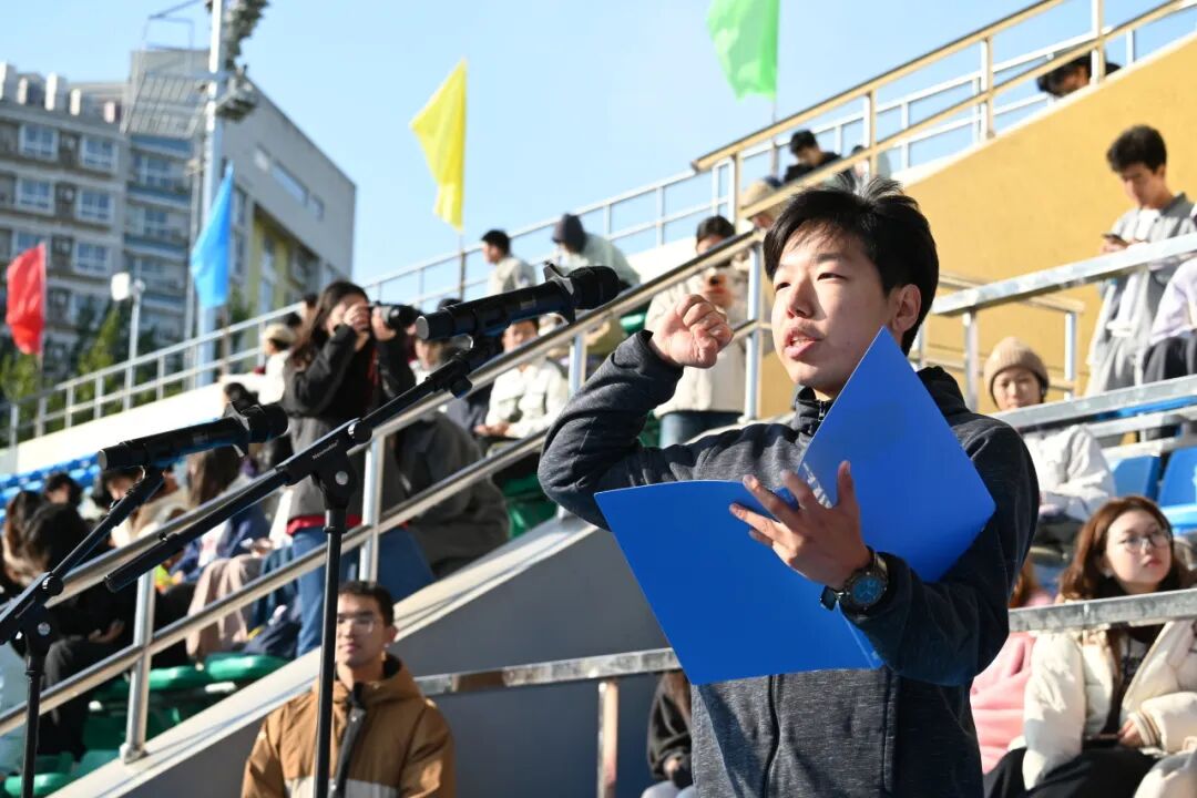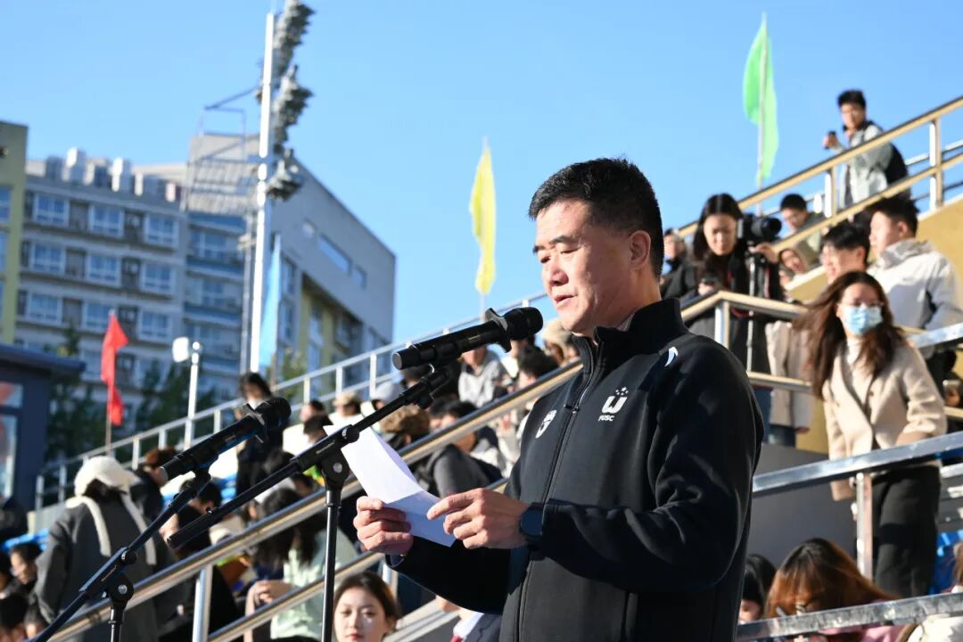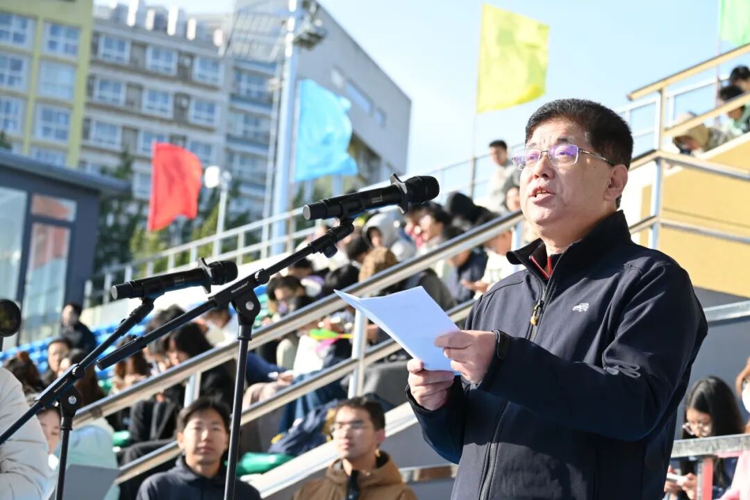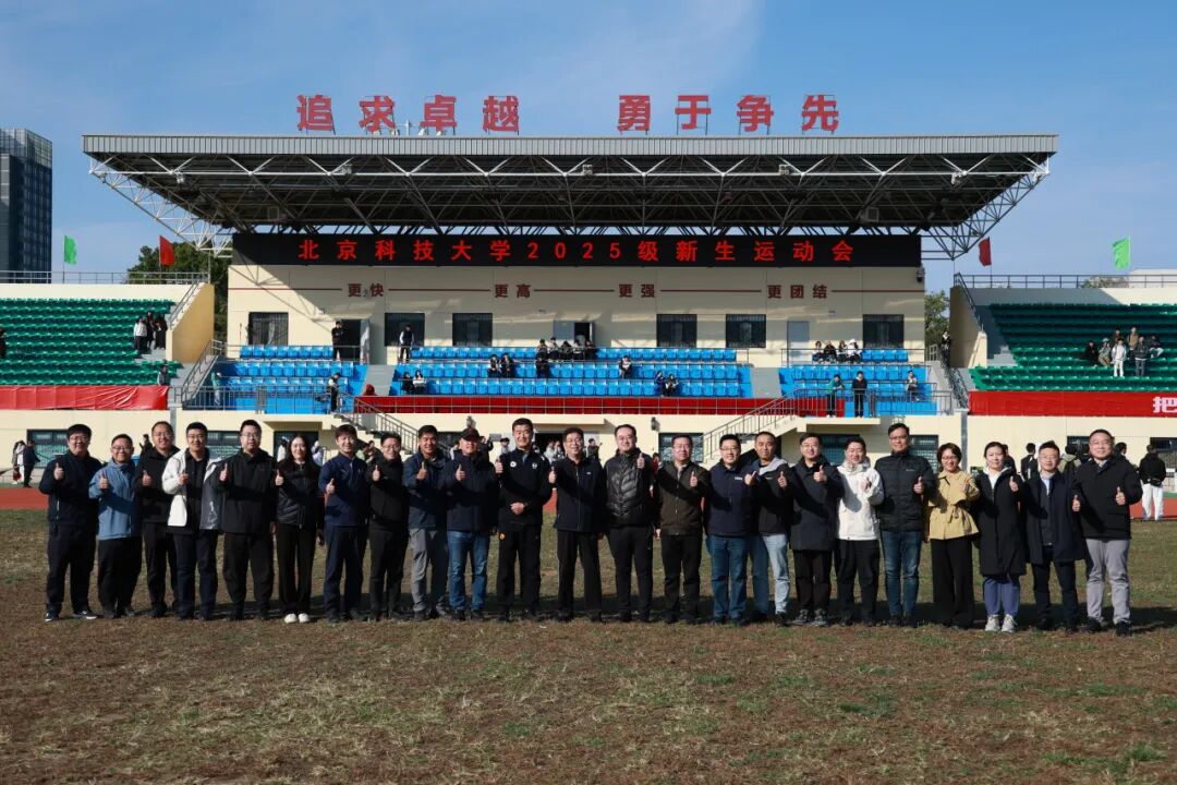 他在致辞中提到,体育承载着国家强盛、民族振兴的梦想。习近平总书记强调,要坚持健康第一的教育理念,加强学校体育工作。北科大始终坚持立德树人根本任务,把体育作为实现立德树人根本任务、提升学生综合素质的基础性工程。我校素有崇尚体育、热爱运动的优良传统。自建校以来,培养了一批以李敏宽、楼大鹏、巩立姣为代表的国家优秀运动员、教练员和体育官员,体育竞技水平和群众性体育活动在北京乃至全国享有盛誉。本届新生运动会,是展示我校2025级学生蓬勃朝气与青春风采的舞台,也是检验入学以来适应能力与团队精神的契机。希望同学们在运动场上挥洒汗水,收获成长;磨练意志,铸就品格;将拼搏精神,延续到未来的学习生活和人生征程中,以强健的体魄、阳光的心态和昂扬的斗志,迎接未来的每一次挑战,书写属于同学们的精彩华章!