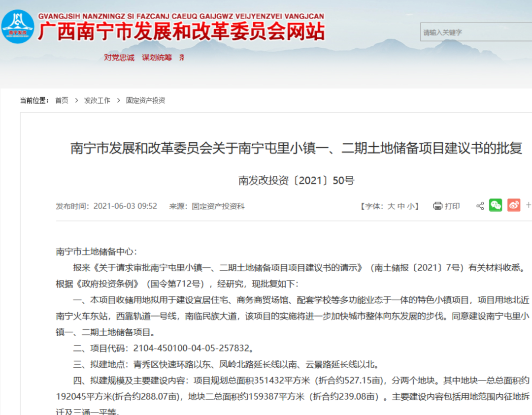 2021年6月3日,南宁市发改委发布了一则公告:屯里小镇一、二期土地储备项目建议书已经获批。