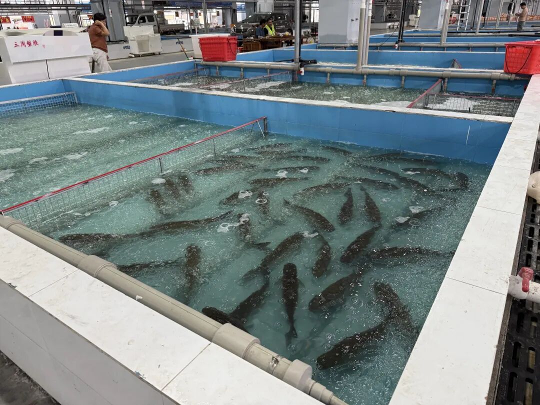 目前营业的摊位大多集中在正门两侧,主要品类包括广东中山脆鲩、湖北白鲢、广西本地四大家鱼等。