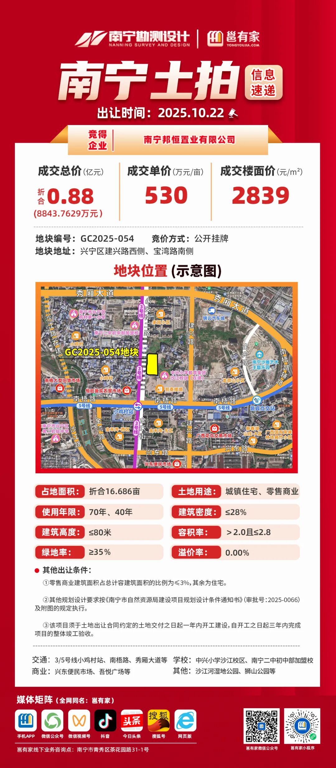 今天(10月22日)上午,位于兴宁区建兴路西侧、宝湾路南侧的GC2025-054地块顺利出让,由南宁邦恒置业有限公司(邦泰)竞得,成交总价约8844万元,成交单价约530万元/亩,楼面价2839元/㎡。