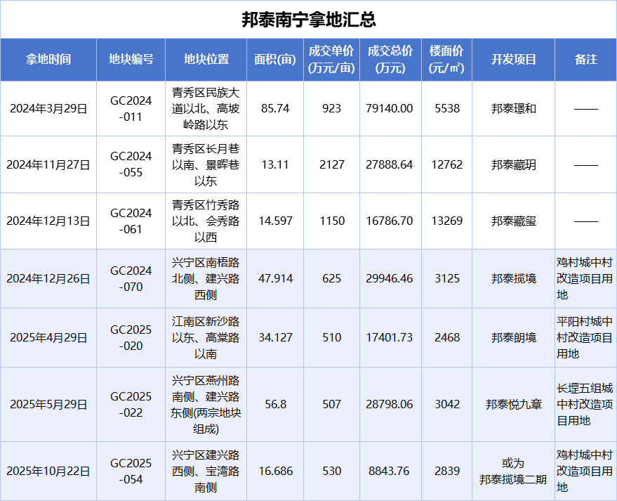 入邕不到两年,邦泰已经斩获了7幅地块,拿地金额约21亿元!