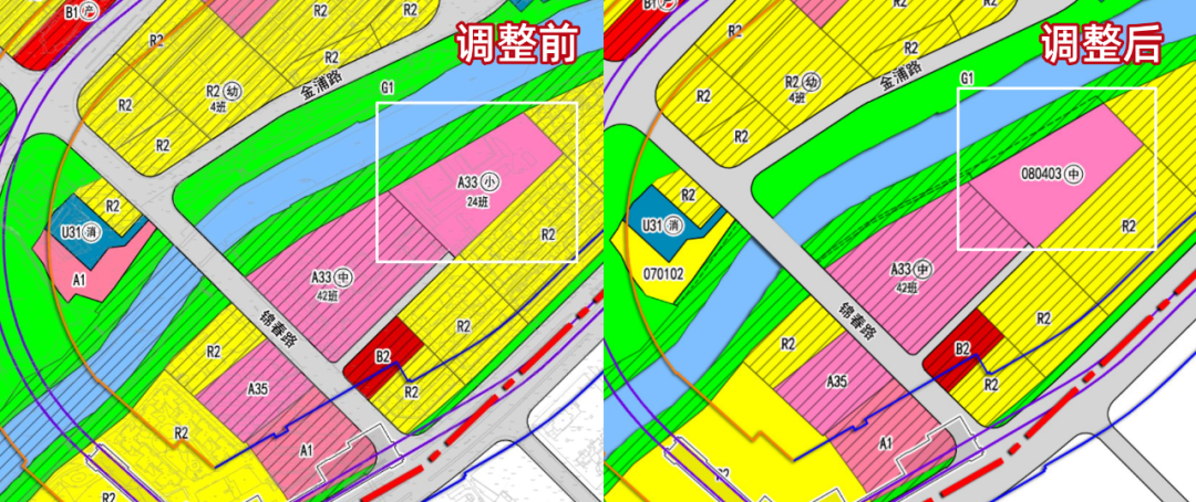 三美学校北侧规划的小学用地,调整成了中学用地。