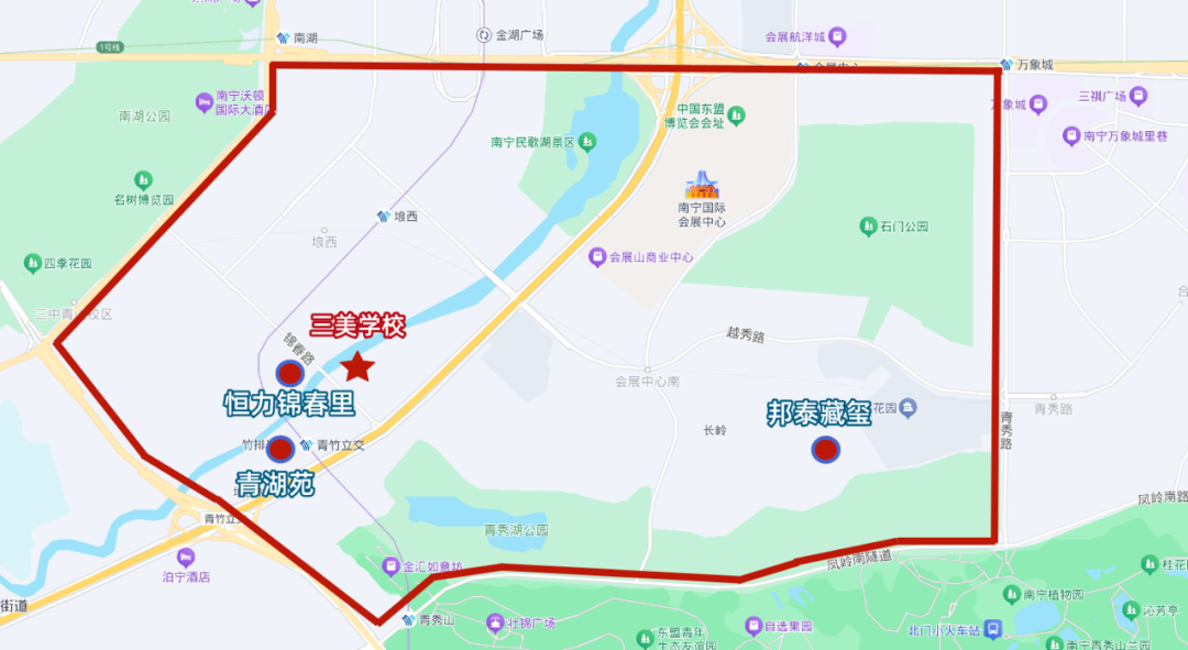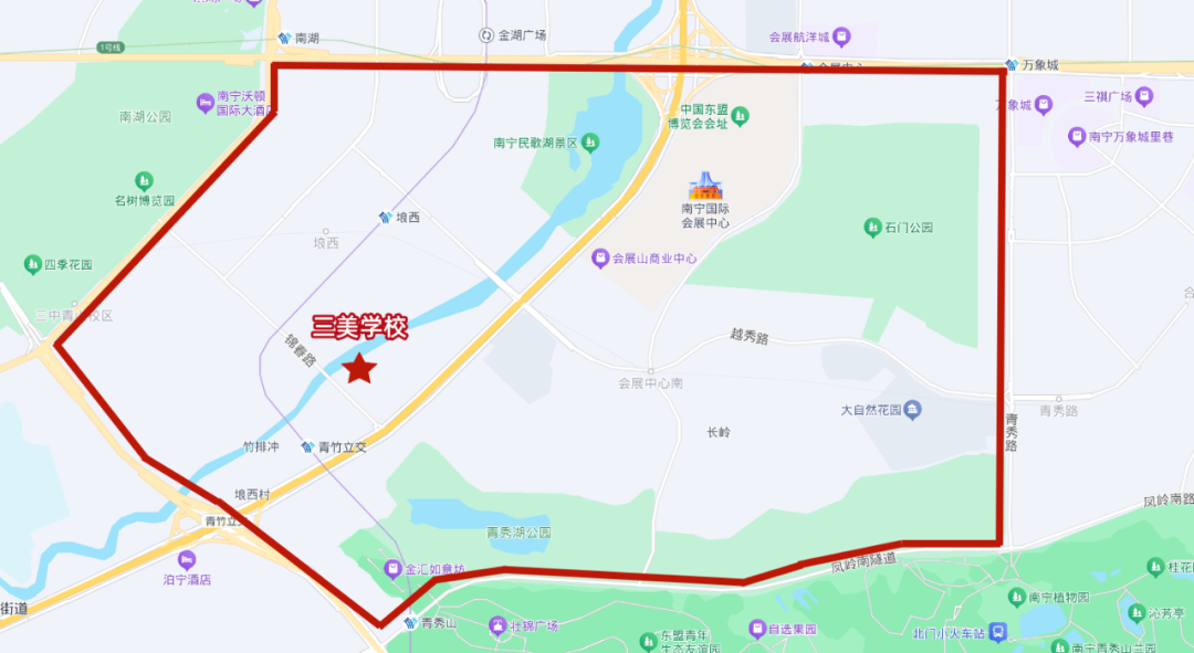 ▲南宁三中初中部青秀校区目前招生范围,仅供参考,底图源百度地图