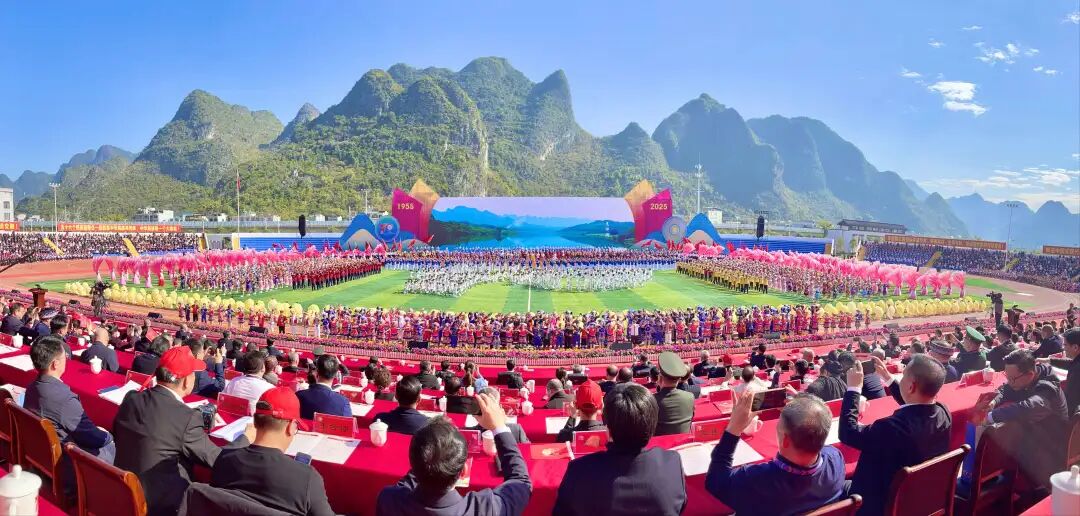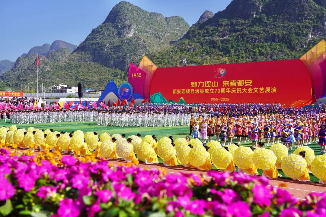 12月15日,都安瑶族自治县举行庆祝大会、群众文艺展演、成就展等活动,喜庆自治县成立70周年,全方位展示都安经济社会发展成就。