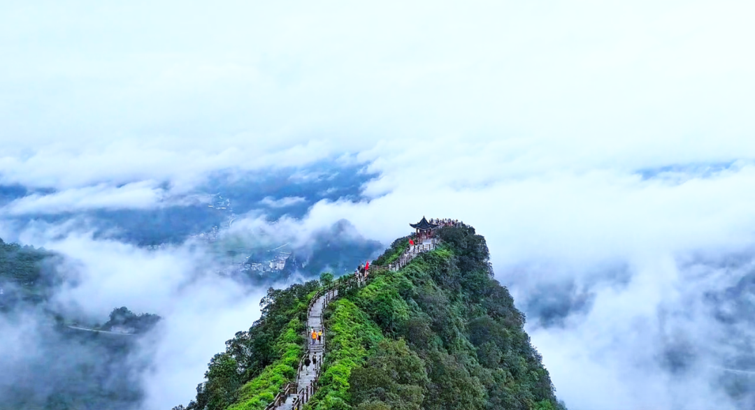清晨,云海在群山间翻涌,山峦若隐若现,宛如水墨画卷。