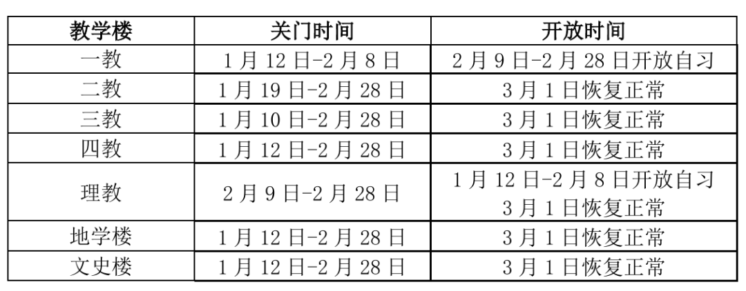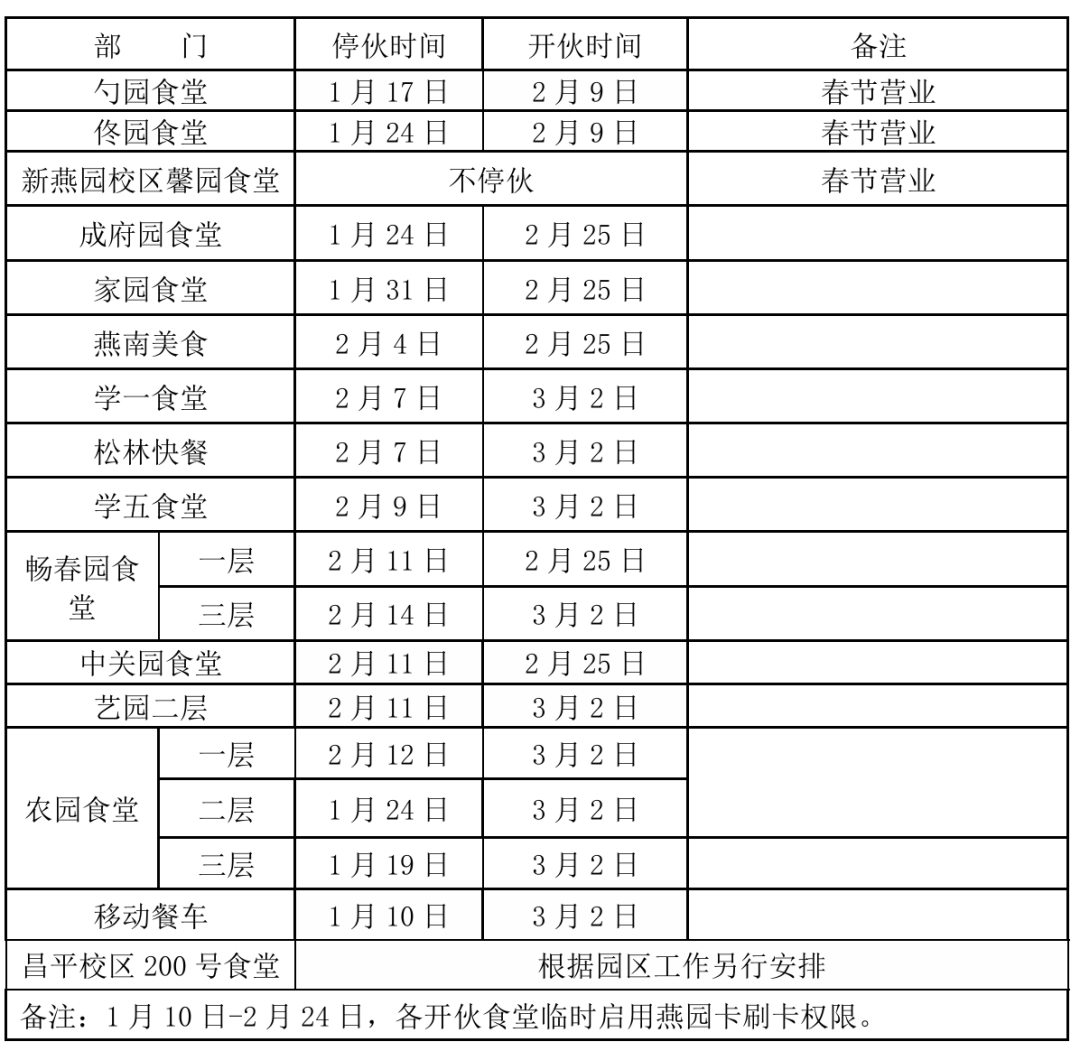 2 校园服务中心车辆管理科班车(新燕园校区)不停运(1月12日-3月1日按周末及节假日时刻表)。