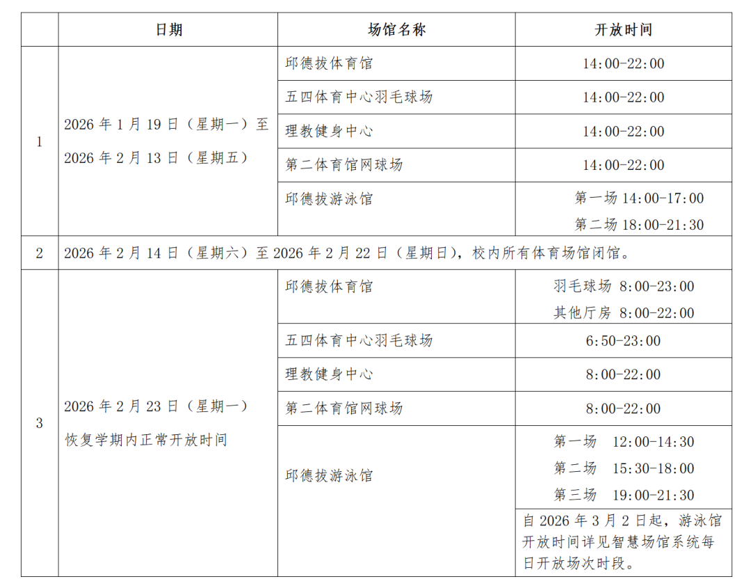 为保障在校师生的体育锻炼需求,寒假期间体育场馆照常运行,具体开放时间调整如下: