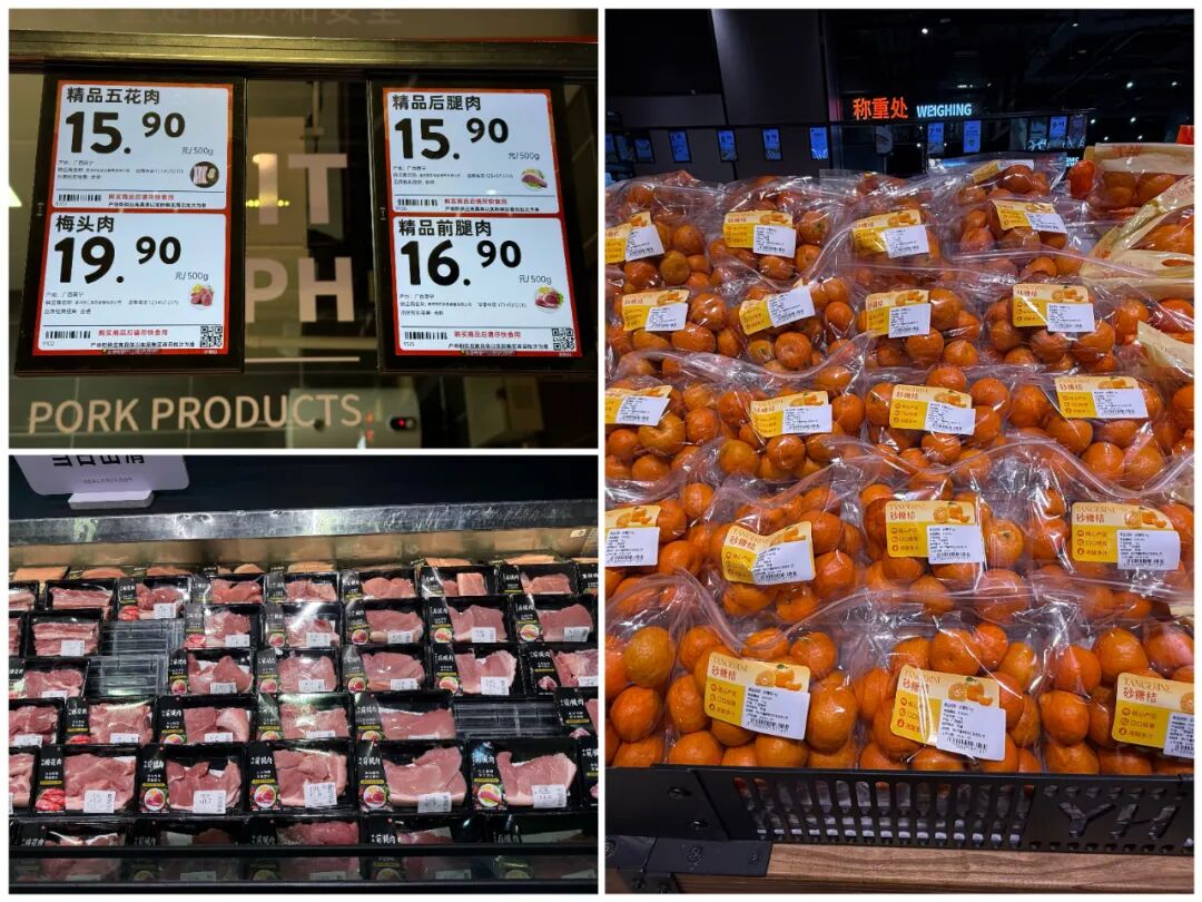 果蔬、肉品等档口的商品摆放整齐,部分还做了预包装,价签方面也有明显标注。