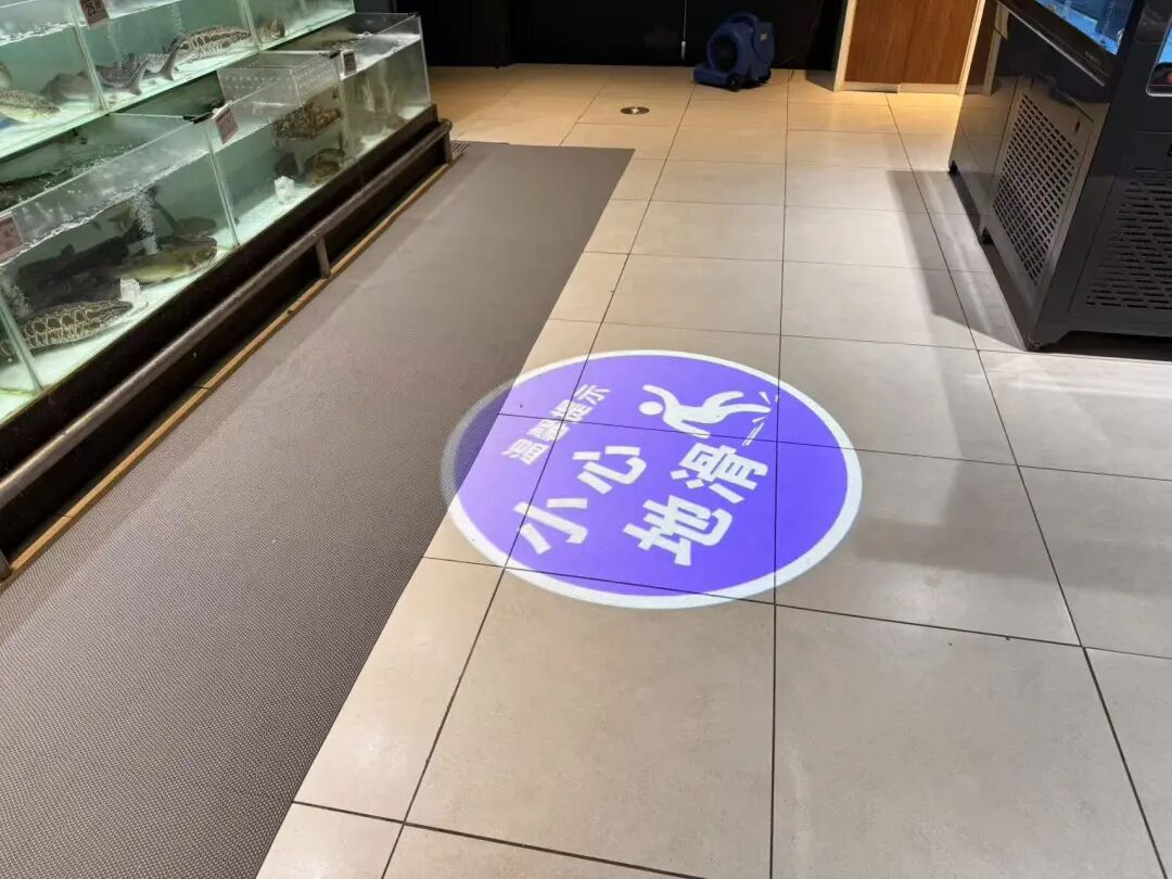 水产、冰鲜等易在地面留有水渍的区域,也会有专门标注“小心地滑”的指示灯。