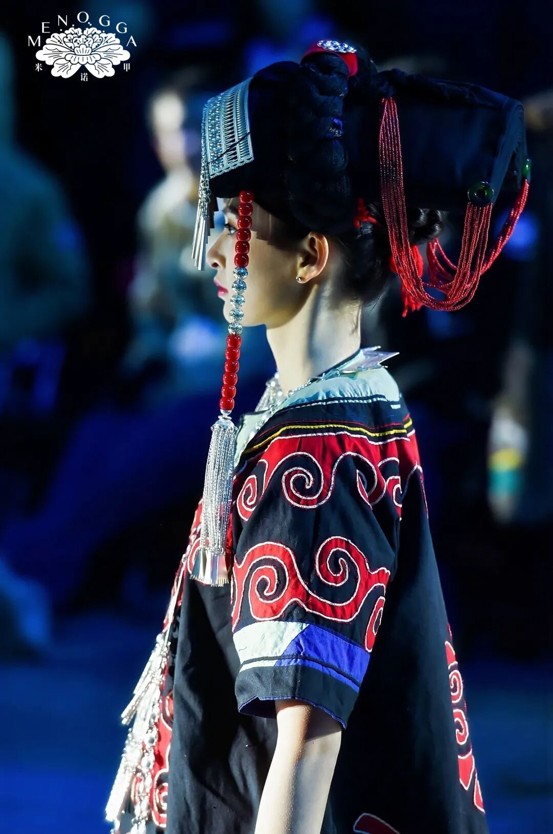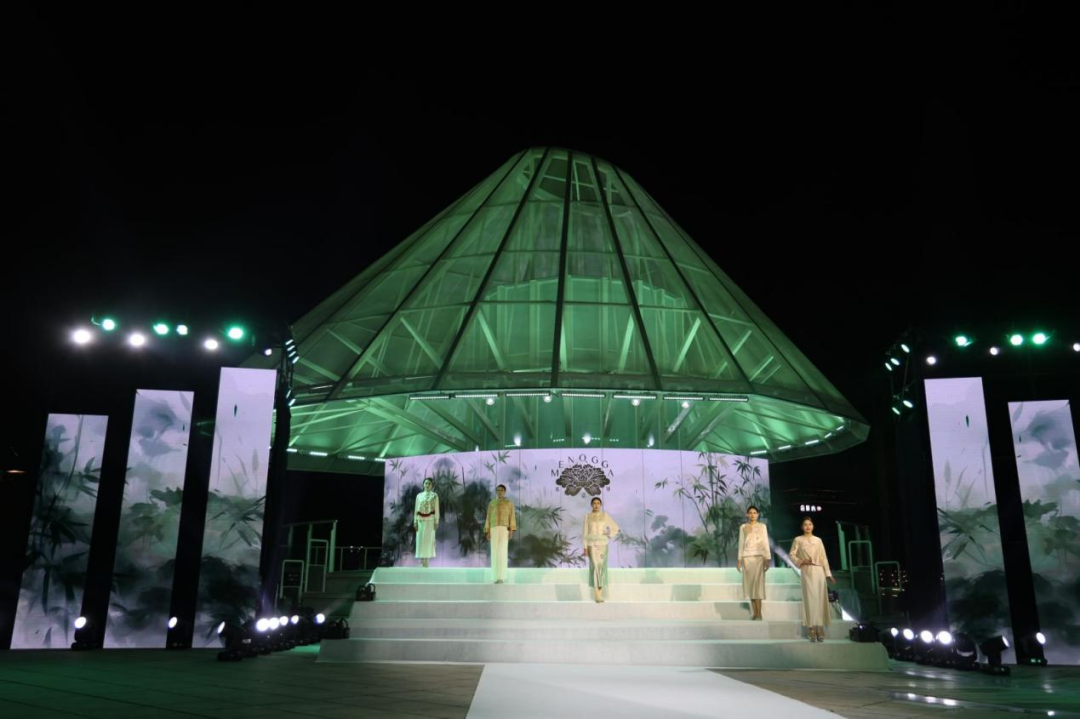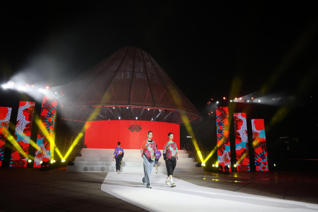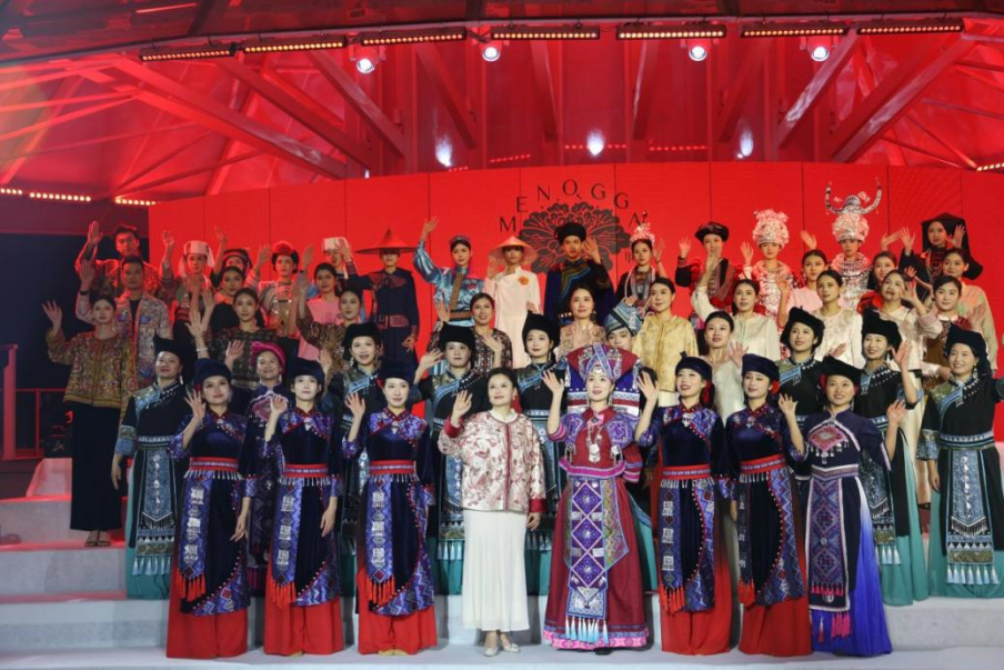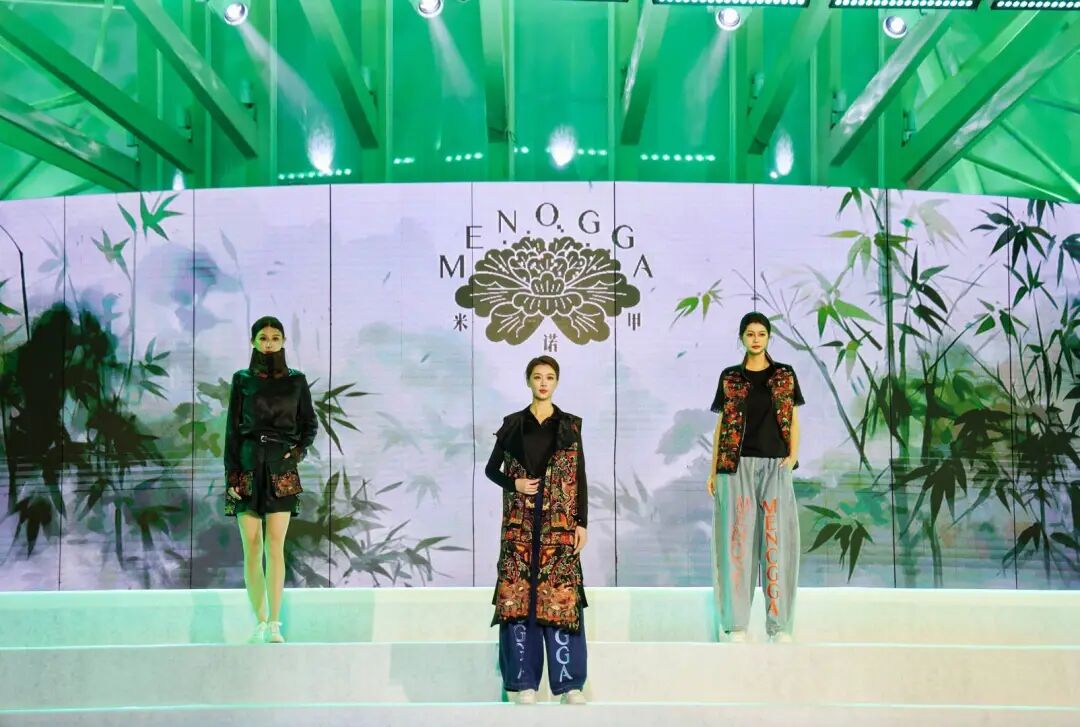 与此同时,艺术馆自主设计、融合广西非遗元素的 “米诺甲” 系列新品时装同步登场。该系列灵感源自广西壮族创世女神姆洛甲的传统神话,服饰图案纷繁雅致、疏密有度,取蛙、鱼、凤等民族图腾元素,融合现代裁剪工艺,以立体廓型诠释服饰艺术,在民族传统底蕴中蝶变出新生代 “国潮” 风尚。舞台上,传统服饰、潮牌服饰与民族表演穿插呈现,歌声、舞步与服饰完美交融,为嘉宾带来一场全方位、沉浸式的文化盛宴。