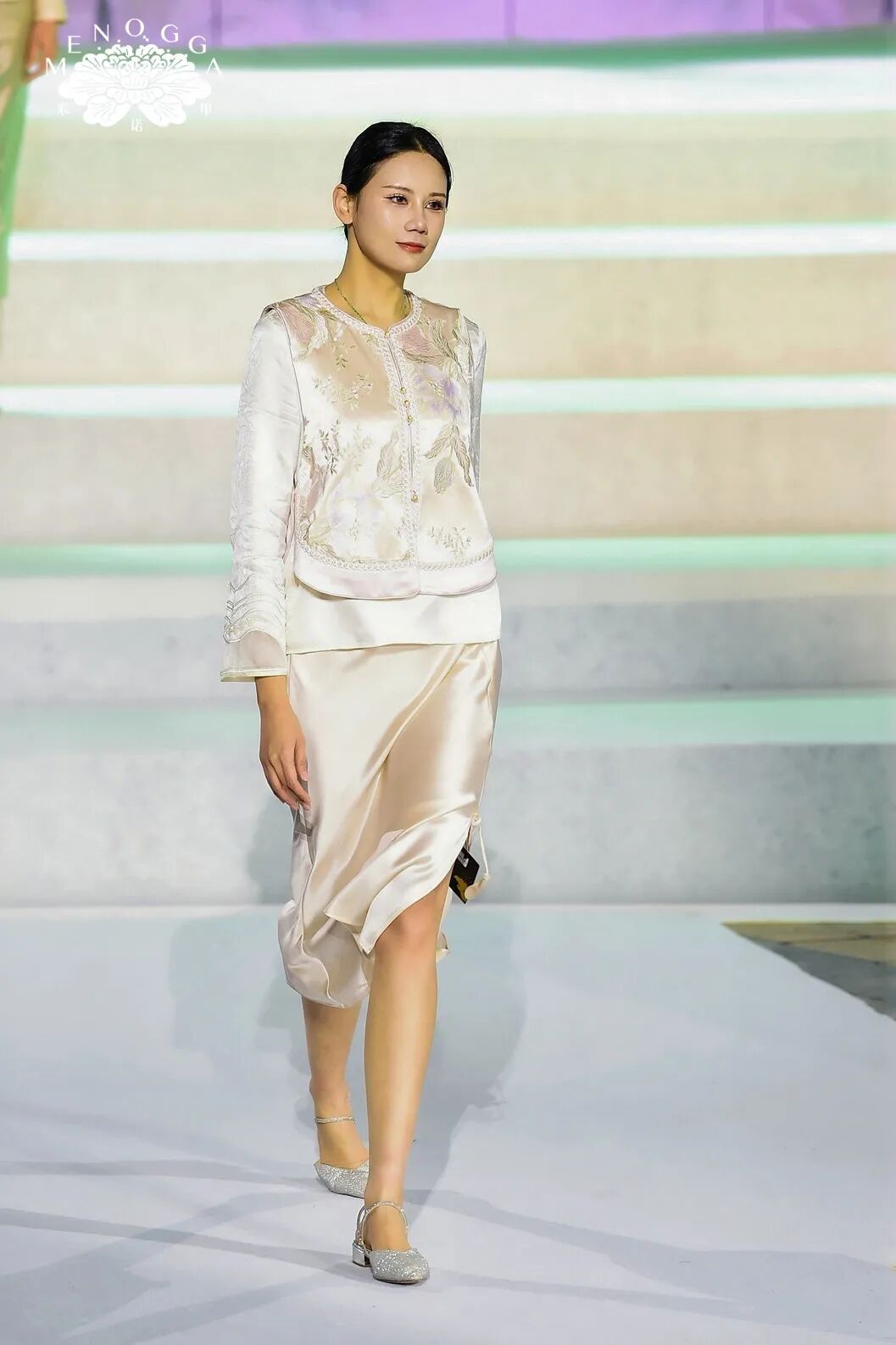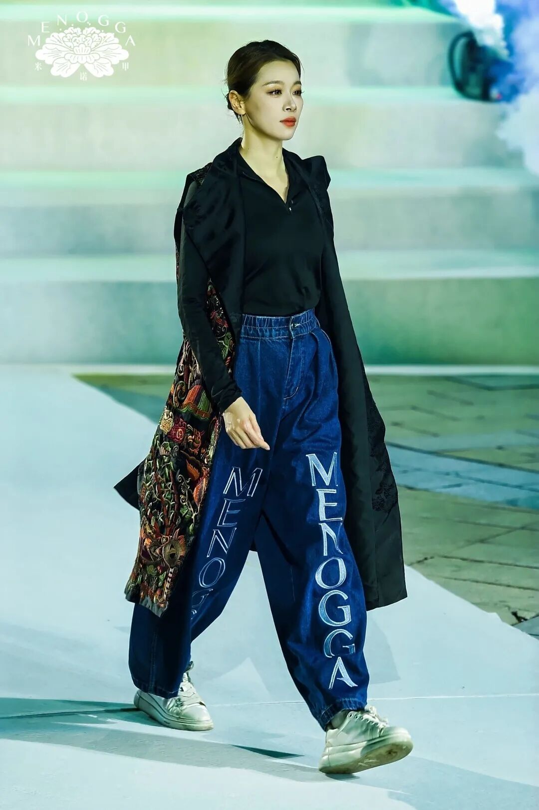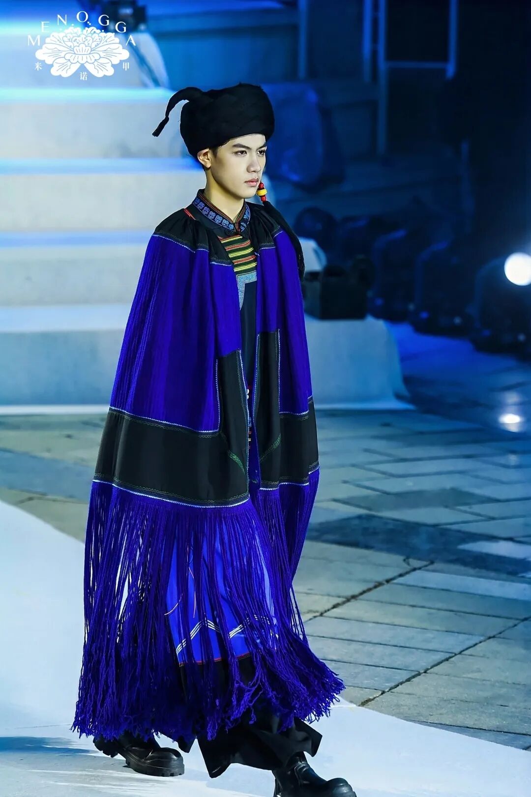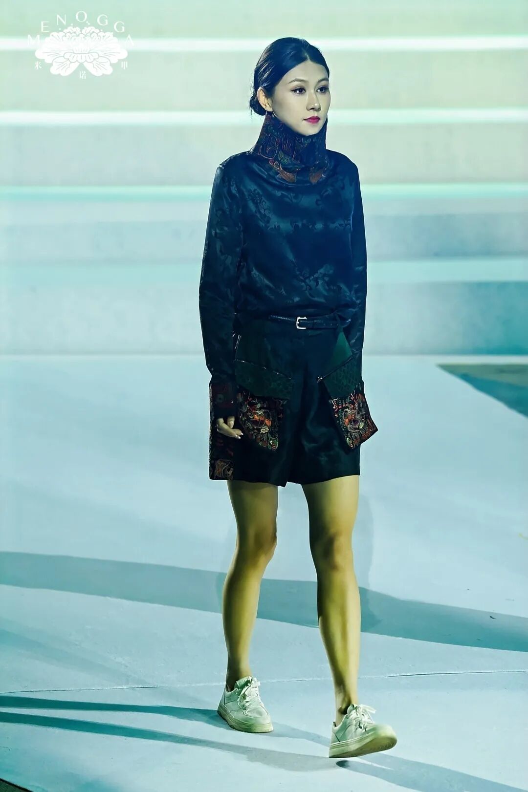 与此同时,艺术馆自主设计、融合广西非遗元素的 “米诺甲” 系列新品时装同步登场。该系列灵感源自广西壮族创世女神姆洛甲的传统神话,服饰图案纷繁雅致、疏密有度,取蛙、鱼、凤等民族图腾元素,融合现代裁剪工艺,以立体廓型诠释服饰艺术,在民族传统底蕴中蝶变出新生代 “国潮” 风尚。舞台上,传统服饰、潮牌服饰与民族表演穿插呈现,歌声、舞步与服饰完美交融,为嘉宾带来一场全方位、沉浸式的文化盛宴。