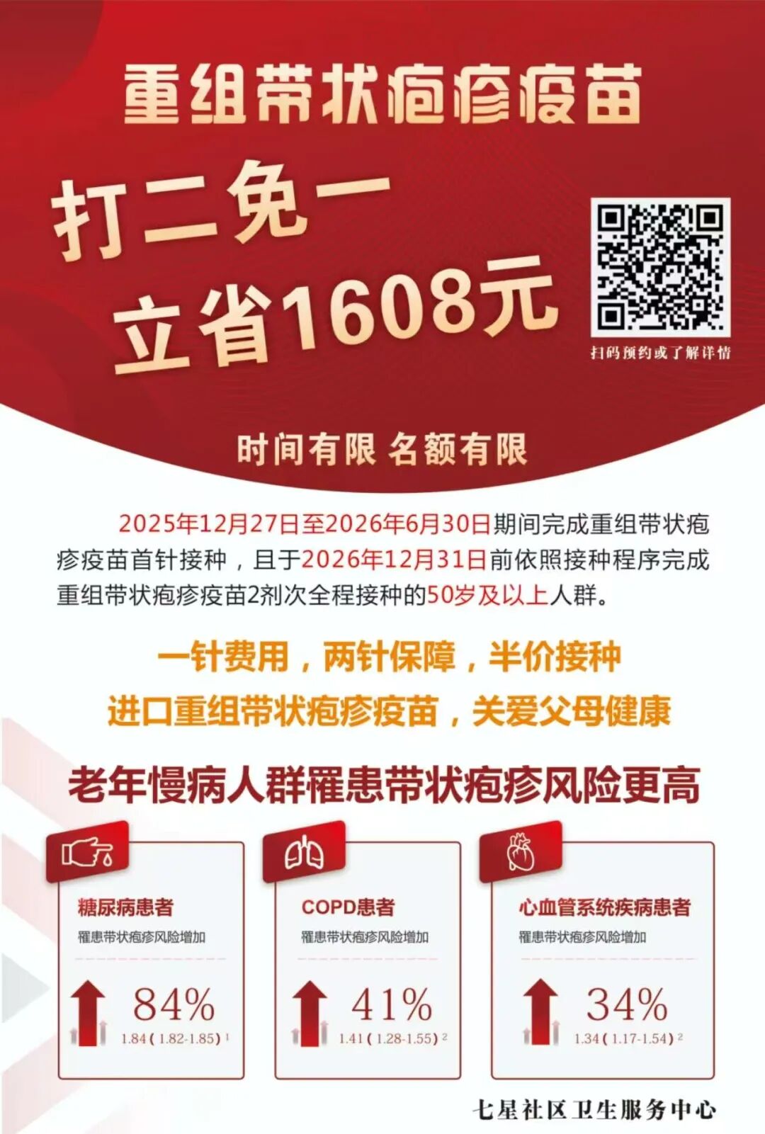 【惠民项目】带状疱疹疫苗打一针免一针专场开放!50岁及以上人群立省1608元!早接种早保护→