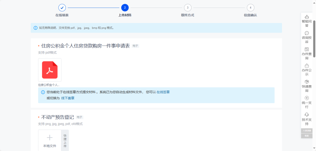 选择“在线签章”或者“线下盖章”后按要求上传材料。