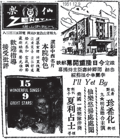 ▲1951年12月9日仙樂戲院廣告:選映名片《仙樂悠揚處處聞》(I’ll Get By , 1950),廣告中誤植為「I’ll Yet By 」