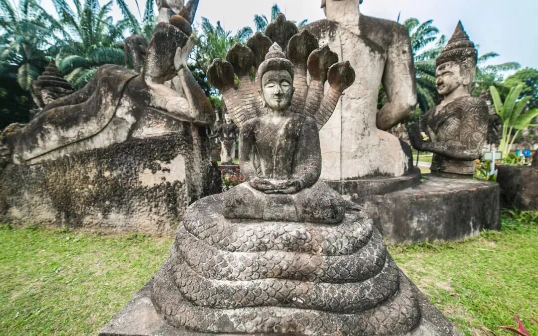 香昆寺,藏在湄公河畔的“神灵之境”,与其说是寺庙,更像一座露天雕塑博物馆。近百座佛教与印度教雕塑错落分布,最震撼的莫过于中央的“天堂地狱塔”,形似巨大南瓜,从“地狱”入口螺旋而上,最终抵达“天堂”,登顶可俯瞰整个公园与对岸的泰国风光。