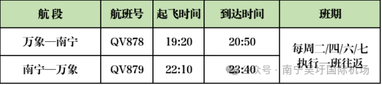 本航季新增开通的南宁—万象点对点直飞航线,计划每周执行4班往返(周二、四、六、日),由老挝国家航空公司运营,执飞机型为C909。具体航班信息为:航班号QV878/9,万象19:20起飞,20:50抵达南宁;南宁22:10起飞,23:40抵达万象,时刻均为北京时间。