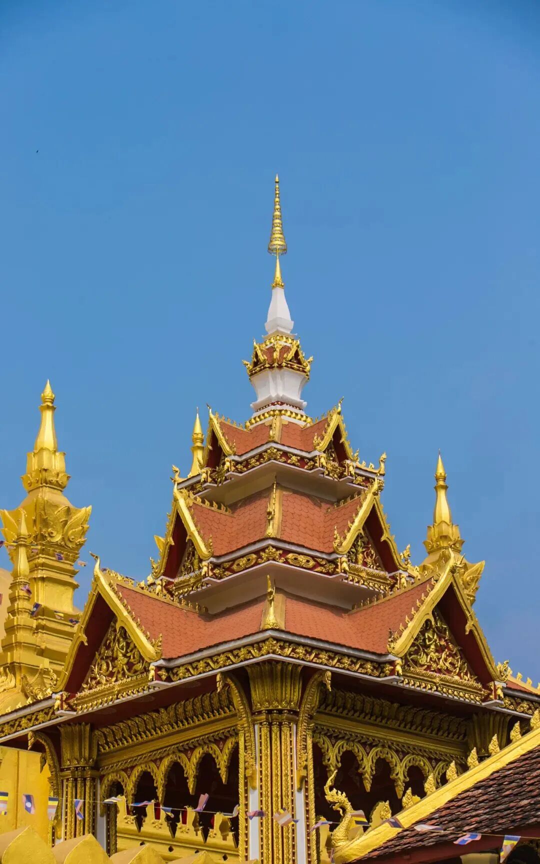 凯旋门,融合法式风情与老挝传统艺术的独特建筑,远看与巴黎凯旋门相似,细看却布满佛教色彩的雕刻。登上顶部可俯瞰万象市区全景与湄公河风光,内部天花板的佛教神话彩绘金碧辉煌,夜晚灯光亮起时,氛围感拉满。