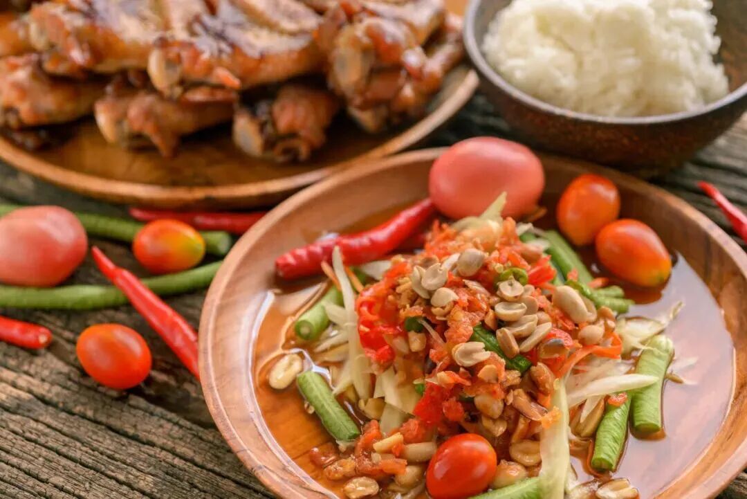 将木瓜剁成丝,搭配新鲜辣椒、西红柿、柠檬、鱼露等,放入石臼中舂成糊状拌匀。酸、甜、辣、咸、鲜五味交织,脆爽解腻。
