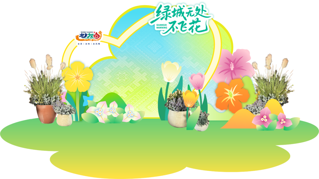 “绿城无处不飞花”的打卡装置,将南宁的春意具象呈现。这里设置了“三月三 趣南宁”“绿城无处不飞花”“水果自由”三大主题打卡装置,繁花从墙头倾泻,绿意在小径蔓延,仿佛一脚踏进了邕城的春天,稳稳拿捏春日氛围感~